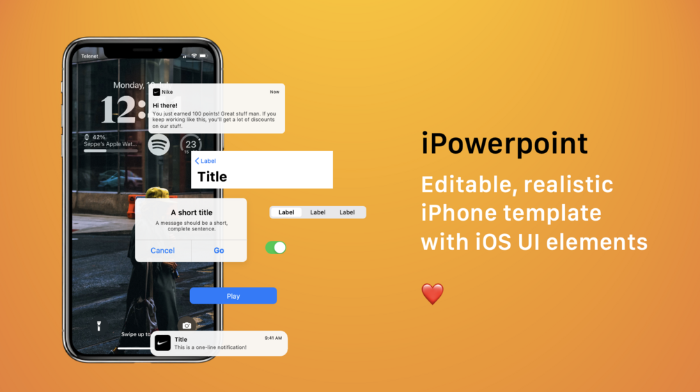 You'll get the template in powerpoint, with a photo-realistic iPhone with notch, navigation, Apple Fonts, Notifcations, Alerts, Navigation, Tabbar, Segmented Controls, Buttons, Checkboxes and a blank template.